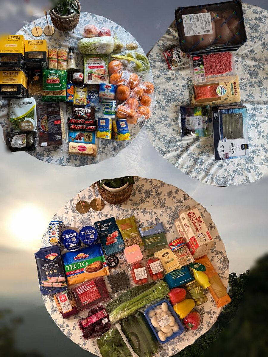 Итак, поехали❤️ Крупы Макароны 13 пачек Лагманная лапша 1 упаковка Тесто слоеное 1 упаковка Нут 1 упаковка Рыба/морепродукты Крабовые палочки 2 упаковки Горбуша 1 упаковка Икра красная 1 упаковка Креветки 800г Форель 150г Мясо/птица Ветчина 10 упаковок Куриная грудка 7,5кг Фарш 750г Яйца 2 упаковки Сыры/молочка Сыр голландский 1 упаковка Камамбер 1 упаковка Сливочное масло 320г Бурата 1шт Сливки 2 упаковки Греческий йогурт 4 шт Моцарелла 1 упаковка Сметана 1 упаковка Фрукты/ягоды Авокадо 2шт Апельсины 1кг Мандарины 1кг Груши 2шт Ежевика 1 упаковка Брусника 1 упаковка Голубика 120г Бананы 5 шт Гранаты 2 шт Ананасы консервированные 2 упаковки Овощи/грибы Свекла 1 упаковка Огурцы 400г Помидоры черри 2 упаковки Капуста китайская 1 шт Руккола 1 упаковка Шпинат 1 упаковка Сельдерей 1 упаковка Перец болгарский 1 упаковка Шампиньоны 1 упаковка Соусы/заправки Цитрусовая заправка 3шт Греческая заправка 2шт Итальянская заправка 1шт Кунжутный соус 1шт Лимонный сок 1 упаковка Закуски/орехи/