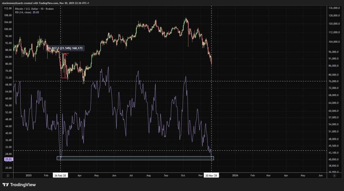 Биткоин: дневной RSI = 25. Это экстремальное значение. Инвесторы, давайте чуть трезво взглянем на происходящее. На графике — RSI на дневке впал в ту же зону, где рынок исторически переставал падать просто по механике: продавцы выдыхаются, импульс распродажи исчерпан, и цена хотя бы делает паузу или локальный разворот. Это не прогноз, что дно уже позади. Сейчас структура рынка слишком неоднозначная, и я уже говорил, что лично перехожу в нейтральную позицию. Но есть факт: Когда RSI уходит к 25 и ниже — рынок статистически не любит продолжать прямолинейное падение. Важно понимать: • это не сигнал на разворот тренда; • это не аргумент “бычки”; • это просто маркер перегрева в продаже. И если у вас вдруг проскальзывает мысль “паник-селл”, возможно, стоит учитывать этот контекст. Чаще всего паника достигает пика как раз в такие моменты. Впереди всё равно будет отскок — вопрос только в том, будет ли он частью большого восстановления или той самой волны «b» перед продолжением снижения. Во