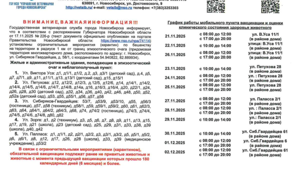 В Новосибирске объявили карантин по бешенству в радиусе 1 км от дома на улице Сибиряков-Гвардейцев, 58/1. Ограничения ввели по распоряжению губернатора Новосибирской области от 17 ноября, сообщила Государственная ветеринарная служба города. Под карантин попали здания на улицах Виктора Уса, Петухова, Сибиряков-Гвардейцев, Зорге и Палласа. В этих районах будет проводиться обязательная вакцинация животных, не привитых ранее или с истекшим сроком предыдущей прививки. Мобильные пункты вакцинации будут работать с 21 ноября по 2 декабря. Они расположены на улицах Виктора Уса, Петухова, Палласа и Сибиряков-Гвардейцев. Время работы пунктов варьируется в зависимости от даты. 21, 22 и 26 ноября будет работать пункт по адресу ул. Виктора Уса, 11/1. 23, 24 и 25 ноября – пункт на Петухова, 28. 27, 28, 29 ноября работает пункт вакцинации ул. Паласса, 2/1. 30 ноября, 1 и 2 декабря вакцинацию будут проводить по адресу ул. Сибиряков-Гвардейцев, 61.