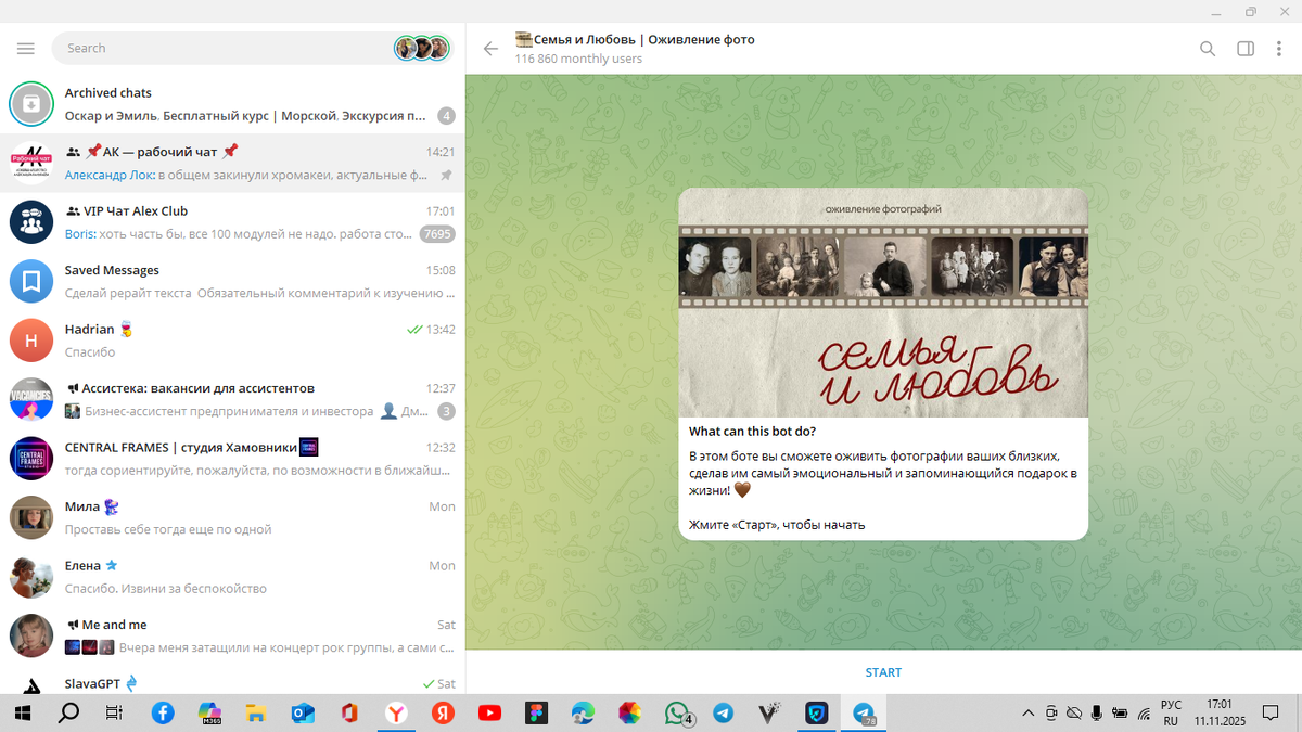 Memorias Vivas Bot предлагает самый быстрый способ анимации фотографий через мессенджер Telegram. Никаких скачиваний приложений, регистраций и сложных настроек — все работает в одном чате.