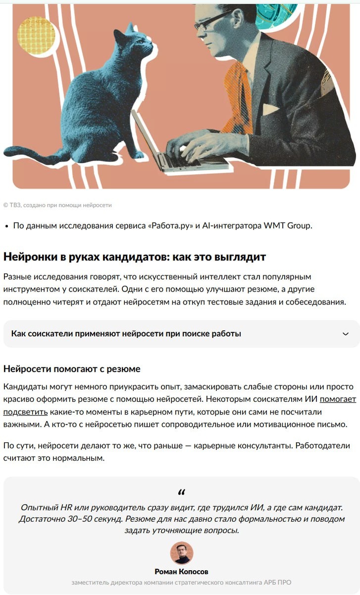 ИИ, HR и котики Недавно вышла статья с моими комментариями на lenta.ru. Поделился ИИ - этикой (видимо новый термин) и нашими кейсами. Ниже короткое содержание: ИИ стал привычным инструментом соискателей: больше половины используют нейросети при поиске работы — от улучшения резюме до прохождения технических собеседований. Но компании все чаще сталкиваются с «нейрокотами в мешке»: на тестах кандидат блестит, а в работе — проваливается. Разбираем, как снизить риски и увидеть реальные компетенции. Как кандидаты используют ИИ 🔹 Описывают навыки, составляют резюме, сопроводительные письма 🔹 Решают тестовые задания — от текстов и стратегий до кода 🔹 Подстраховываются на онлайн-собеседованиях: зачитывают ответы, подглядывают в нейросеть Резюме, улучшенное ИИ, — не проблема. HR-ы и так проверяют факты в разговоре. Гораздо опаснее тестовые задания, полностью сделанные нейросетью: там легко проявляются галлюцинации, ложные выводы и отсутствие логики. Это видно уже на собеседовании — как