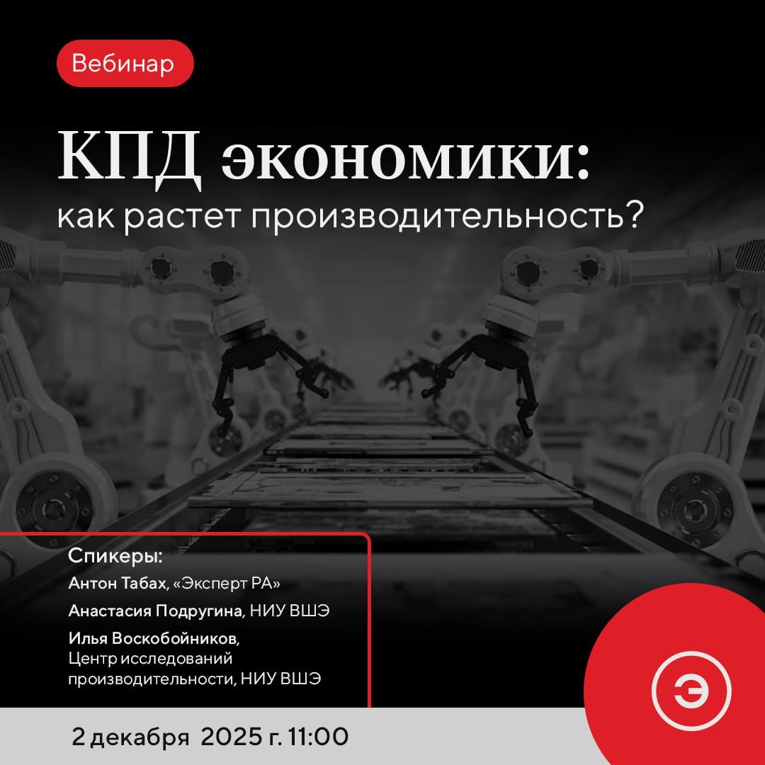👨🏫👨🏫👨🏫👨🏫 КПД экономики: как растет производительность? 🗞🗞🗞🔍 Где: онлайн Когда: 2 декабря 2025 г., 11.00 мск 💬 Производительность – ключевой фактор долгосрочного устойчивого экономического роста. На нее влияют не только объем капитала и качество труда, но и более сложные и трудноизмеримые параметры: доступ к технологиям и данным, организационные и управленческие практики, институциональная среда, структура отраслей и глубина участия в трансграничных цепочках создания стоимости. В текущих условиях неопределенности и геополитической напряженности рост производительности стагнирует. В России же именно на него сделана основная ставка по достижению высоких темпов экономического роста в условиях дефицита кадров. На вебинаре 2 декабря обсудим: · Как правильно измерить производительность? · Исчерпало ли себя влияние цифровизации, или искусственный интеллект сможет увеличить производительность в мире? · Будет ли производительность в России расти темпом 2,5% в год? Какие факто