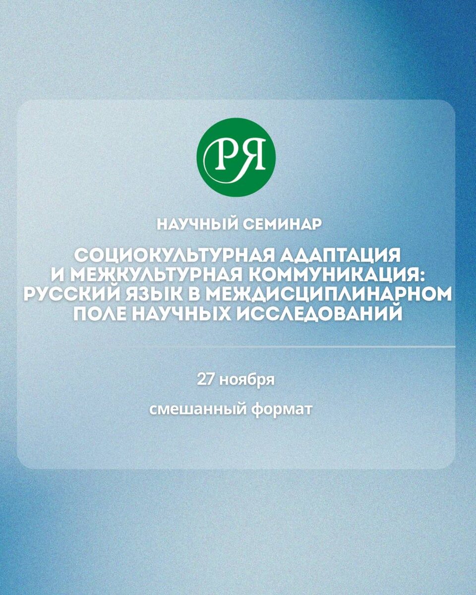 ☺️ Приглашаем на научный семинар ИРЯ РУДН! 27 ноября 2025 г. (четверг) в 16:00 по московскому времени состоится заседание постоянно действующего научного семинара «Социокультурная адаптация и межкультурная коммуникация: русский язык в междисциплинарном поле научных исследований». Семинар организован кафедрой русского языка и лингвокультурологии Института русского языка РУДН в рамках научной школы «Лингвокультурология и профессиональное общение» (рук. — проф. В. В. Воробьёв). 🟦Формат: смешанный (очно + дистанционно) 🟦Тема заседания: «Репрезентация языка и культуры в различных аспектах лингвокультурологии» 🔗 Регистрация 🎥 Ссылка на подключение 📚 Вопросы для обсуждения: 🔹Лингвокультурология XXI века: актуальные направления. 🔹Сопоставительный аспект лингвокультурологии. 🔹Репрезентация языковой картины мира в современных медиа. 🔹Язык, культура и этнос в лингвокультурном анализе. 🤩 Будем рады вашему участию и интересным научным дискуссиям!