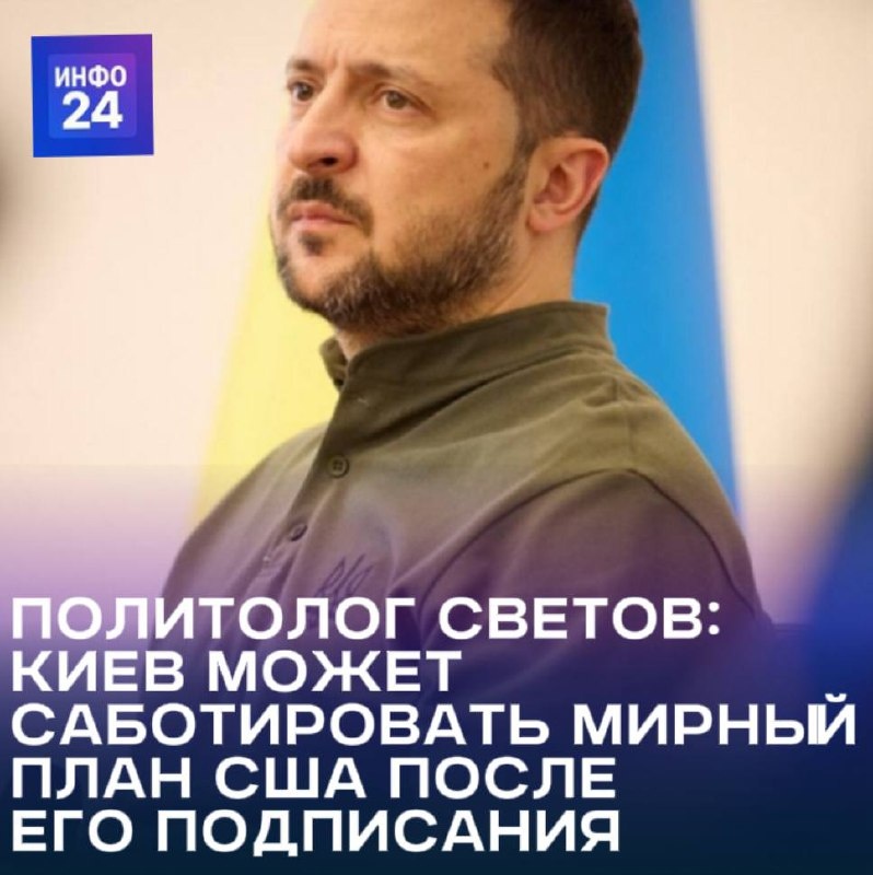 В ответ на пост 🔵🔵🔵 Зеленский может саботировать реализацию нового мирного плана США после его подписания. Так считает политолог Юрий Светов. Ранее стало известно, что в США рассчитывают на подписание Владимиром Зеленским нового плана по мирному урегулированию украинского конфликта до 27 ноября. При этом в Киеве скептически относятся к возможности соблюдения таких сроков, так как Зеленский категорически не согласен с рядом ключевых пунктов плана и готовит собственные контрпредложения для передачи США. 🤐 «Не стоит исключать сценария, при котором Зеленский подпишет мирный план США, а выполнять не будет. Вот здесь как раз всё и упирается в вопросы влияния и воздействия. Американцы уже убедились, что они неспособны влиять на Россию. Мы воюем сами, своим оружием, со своими разведданными, а Украина всё это заимствует. Так что в ближайшее время мы увидим, насколько велико влияние тех, у кого она заимствует, чтобы заставить Киев делать то, что ему прикажут», — отметил Светов. 📍 Подпис