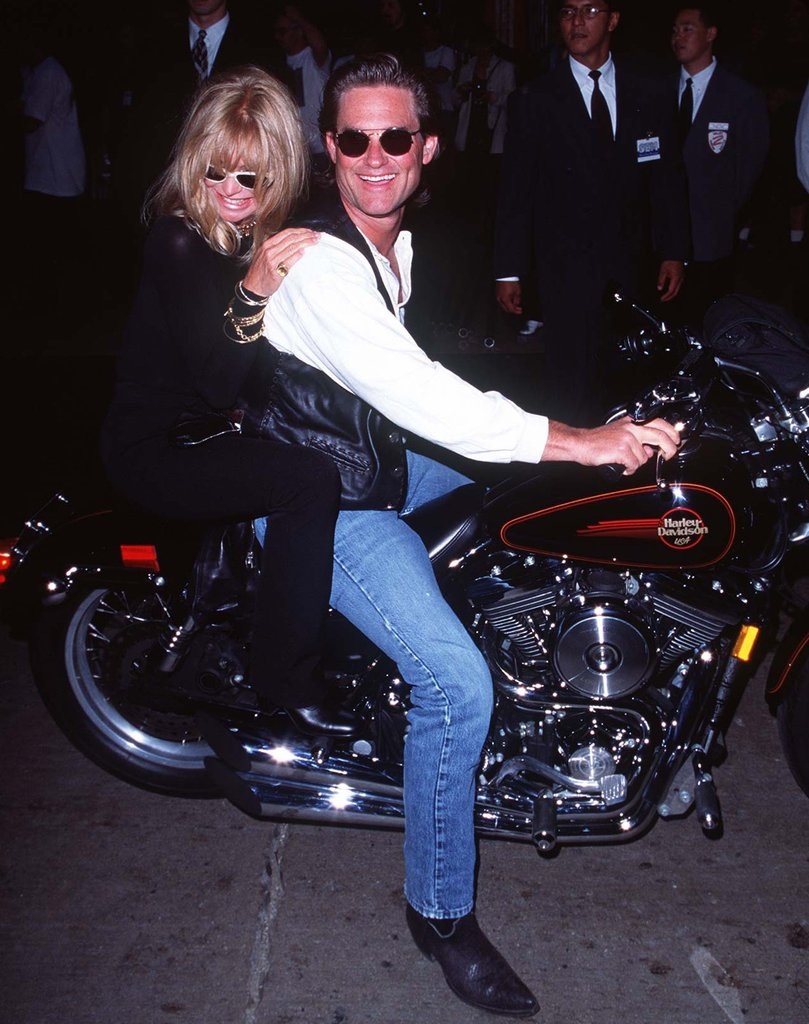🏍На фото: Голди на мотоцикле с мужем, актером Куртом Расселом и с партнером по фильму "Птичка на проводе" Мелом Гибсоном.