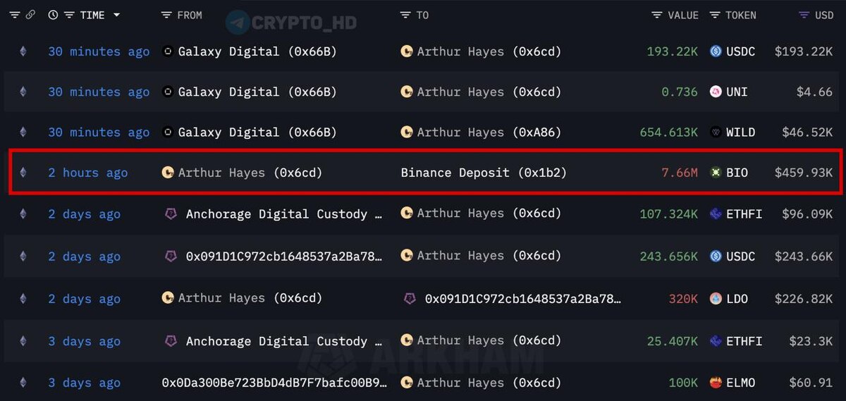 🫡 Артур Хейс продал 7,66m #BIO ($460k) с убытком $640k (-58%) – Arkham