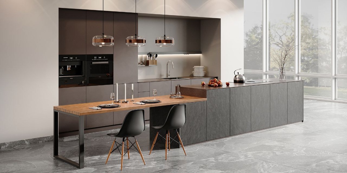Современная кухня с островом 💖 Эта кухня воплощение современного минимализма, где сдержанный дизайн подчеркивает качество исполнения. Гладкие фасады из окрашенного МДФ в теплом серо-коричневом оттенке создают эффект целостного пространства, а встроенные шкафы обеспечивают идеальный порядок без визуального шума. ⭐️ Остров объединяет функциональность и эстетику: фактурный сланец и массив дуба в отделке подчеркивают природную глубину текстур. Инновационные системы открывания без ручек, матовые поверхности и сочетание камня с деревом формируют атмосферу утончённой роскоши без излишней демонстративности. 📎 Это кухня для тех, кто ценит простоту формы, благородство материалов и совершенство в каждой детали. Рассчитать проект