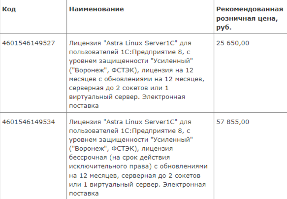 Фирма "1С" объявляет о начале продаж совместных продуктов "Astra Linux Server1C("Воронеж") для 1С:Предприятие 8" с 28.10.2025. Astra Linux Server1C("Воронеж") – серверная операционная система с усиленным уровнем защиты информации, сертифицированная ФСТЭК, предназначенная для защищенных IT-инфраструктур любого масштаба и работы с данными любой степени конфиденциальности, адаптированная для работы сервера "1С:Предприятие". Встроенные в операционную систему механизмы обеспечения безопасности: Применимость: Российская компания ООО "РусБИТех-Астра" входит в Группу Астра и специализируется на проектировании и разработке операционных систем, средств виртуализации, средств управления ИТ-службой, ИТ-инфраструктурой и ИТ-активами, систем контейнеризации, средств мониторинга и управления, СУБД и других инфраструктурных решений. Стоимость совместных продуктов "Astra Linux Server 1C ("Воронеж") для 1С:Предприятие 8" для конечного пользователя С 28.10.2025 в прайс-лист 1С будут добавлены позиции:
