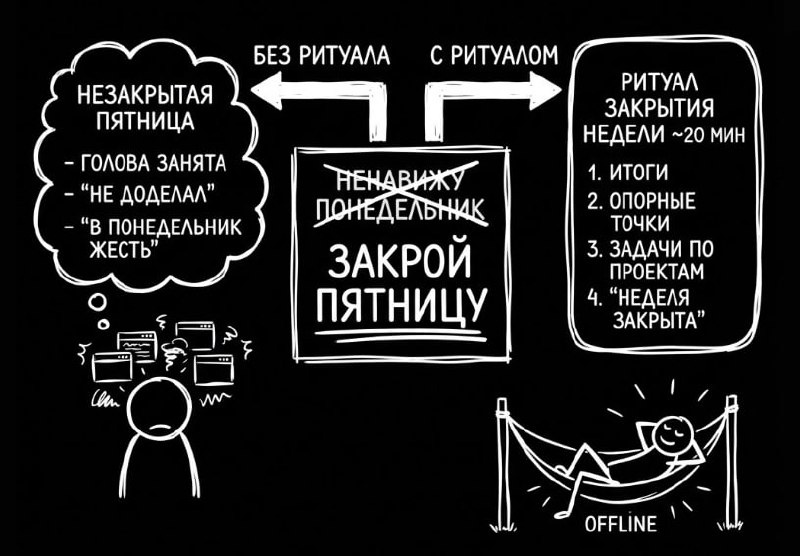 В какой-то момент я поймал себя на том, что ненавижу не понедельник... Я ненавижу свою незакрытую пятницу. Вроде и поработал, и задачи делал, а организм живет так, как будто вкладка недели в голове все еще открыта. Выходные идут вполсилы - фоном крутится "не доделал", "надо бы подумать", "в понедельник ... жесть". Размышляя на эту тему, мысль пришла а что если проблема не в понедельнике, а в том, как я заканчиваю пятницу? Так я начал формировать простой ритуал закрытия недели, (при штатной погоде) Он занимает 30-60 минут, зато мозг и тело получают право официально "уйти в оффлайн" ⚡️ Вот как это выглядит. 1. Останавливаюсь и подводжу итоги недели Открываю задачу "Итоги недели №47" и отвечаю на три вопроса: 1. Что я продвинул по ключевым направлениям 2. Что не сделал и почему на самом деле 3. Какие выводы на будущее Тут, конечно, важно честно зафиксировать не только "галочки", но и мышление - какие решения сработали, какие нет. 2. Фиксирую опорные точки следующей недели Открываю