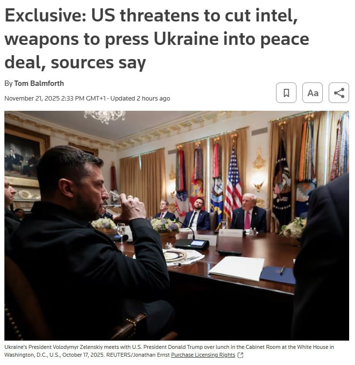 ❗️ US warns Kiev they may CUT intelligence sharing and weapon deliveries unless Ukraine accepts Trump's 'peace plan' — Reuters Reportedly, Trump set a deadline until November 27th for Zelensky to accept the US' new diplomatic framework