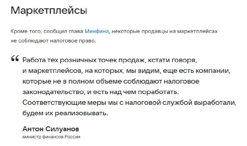 Теневая экономика и маркетплейсы: важное из интервью Силуанова Министр финансов России Антон Силуанов 21 ноября дал интервью телеканалу «Россия 24». Финансы Mail собрали важные заявления, сделанные главой финведомства. Кроме того, сообщил глава Минфина, некоторые продавцы на маркетплейсах не соблюдают налоговое право. Ну что жешь... опять продавцы виноваты 🤷♂️🙈🙊 Подробнее.