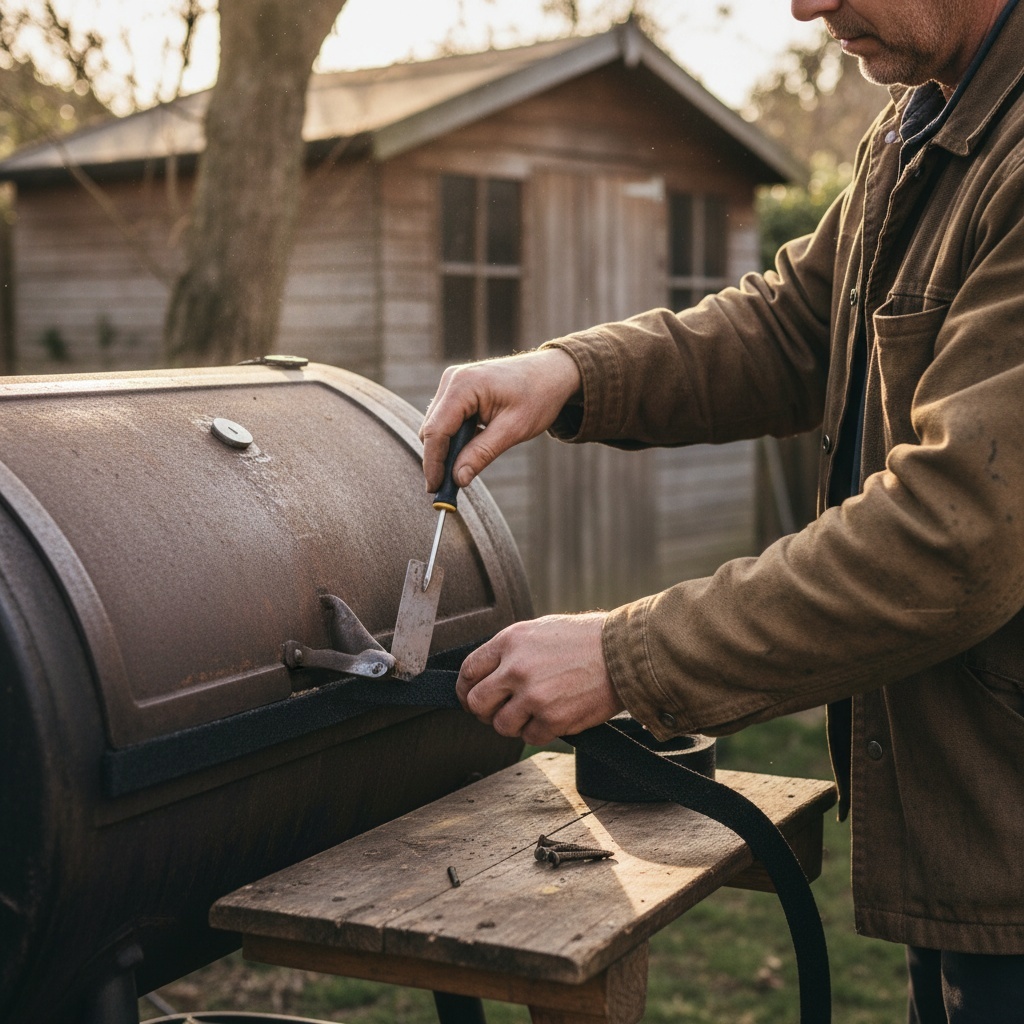 Материалы: печной канат 6–12 мм или силиконовый уплотнитель, высокотемпературный герметик RTV, нержавеющие скобы/саморезы с шайбами.