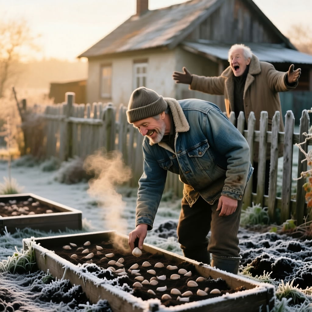 А я вчера вышел на грядку… и посадил чеснок. — Ты что, с ума сошёл? — крикнул Иван Петрович через забор. — Замёрзнет же всё! Я только улыбнулся.