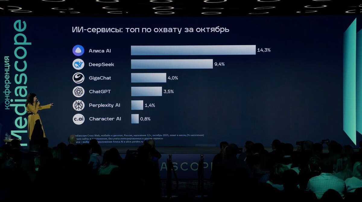 Mediascope выкатил топ самых популярных нейронок в России — на первом месте с большим отрывом оказалась Алиса AI, которой пользуются 14,3