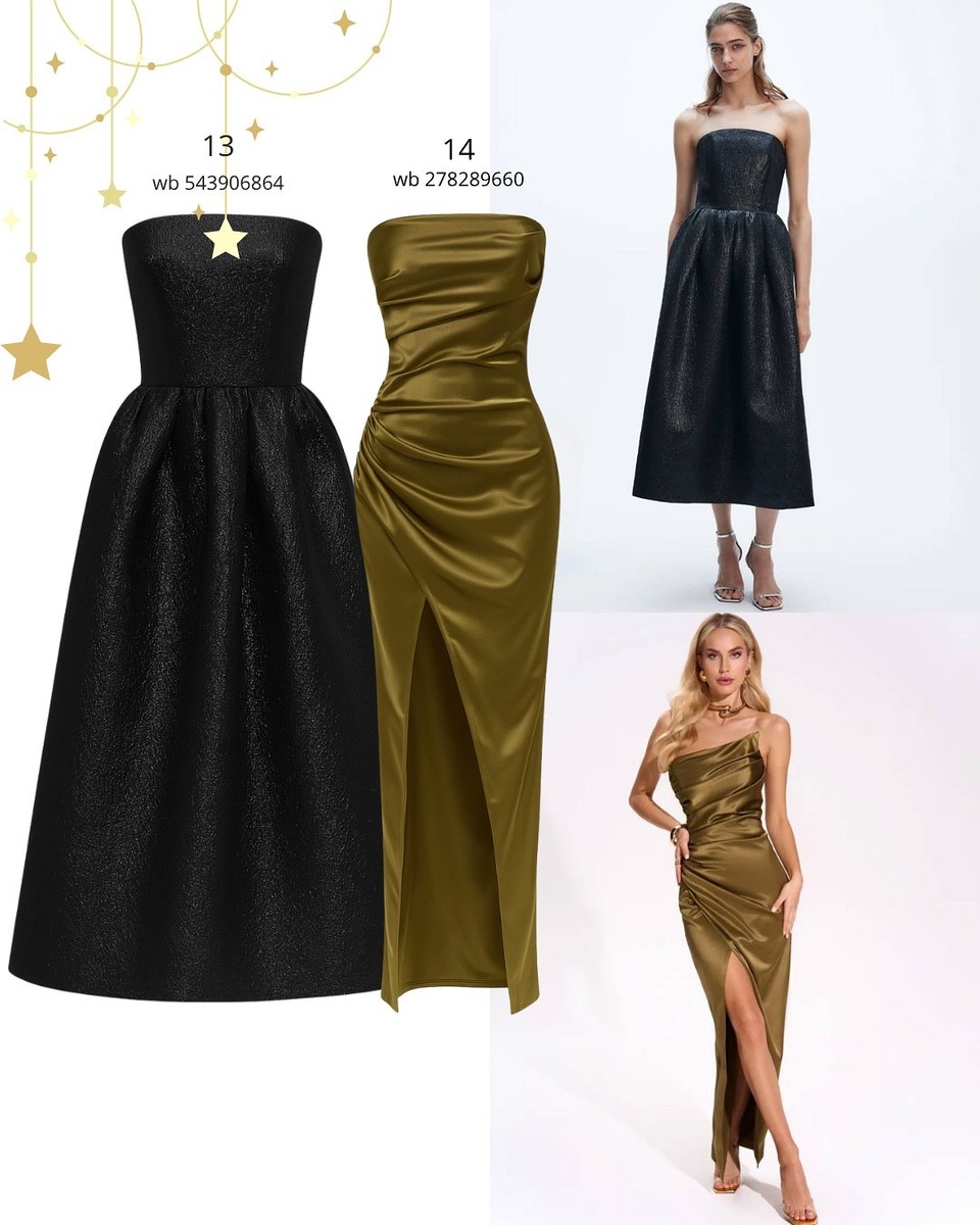 Новый год — это особенное время. Именно в эту ночь нам хочется сиять особенно ярко, создавать вокруг себя атмосферу торжественности и привлекать внимание красивыми, выразительными образами. Правильно подобранное платье способно подчеркнуть женственность, добавить уверенности и стать главным украшением вечера. Представляю роскошную новогоднюю подборку с Вайлдберриз. Все модели идут строго по артикулам, с подробными описаниями и советами стилиста. В подборке преобладают глубокие оттенки, благородные фактуры и эффектные силуэты, которые подойдут для ресторанов, новогодних ужинов и праздничных фотосессий. Платье номер 13 Артикул 543906864 Чёрное вечернее платье с мягким переливом фактуры — это выбор для тех, кто любит сдержанную роскошь. Его силуэт создаёт королевское настроение и подчёркивает достоинства фигуры. Описание модели: Плотный корсетный верх красиво открывает линию плеч и подчёркивает статную осанку. Юбка миди мягко расходится книзу и создаёт элегантный, утончённый силуэт. Факт