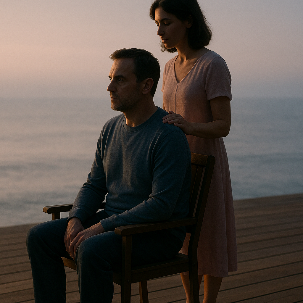 Он молчал. Людмила подошла ближе, встала рядом, положила руку ему на плечо. Он был тёплый, живой, но какой-то отсутствующий, словно его тело здесь, а сам он далеко.