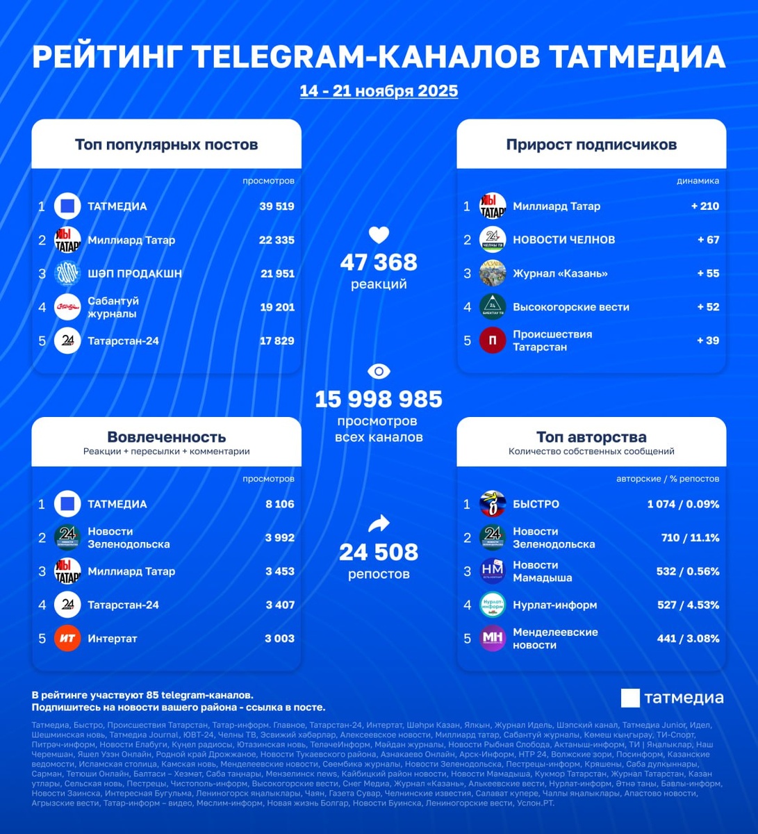 В ответ на пост 📊📱 Новый еженедельный рейтинг tg-каналов Татмедиа | 14 - 21 ноября Каналы с наибольшим числом просмотров: 1. ТАТМЕДИА - 1 984 194 2. Новости Зеленодольска - 1 131 005 3. БЫСТРО - 929 543 4. Нурлат-информ - 783 801 5. Новости Мамадыша - 768 998 Посты с наибольшим числом просмотров: 39 519 🔹 ТАТМЕДИА: Как Татарстан защищает жителей от недобросовестных подрядчиков. 22 335 🔹 Миллиард Татар: «Ленин, к сожалению, не татарин». 21 951 🔹 ШӘП ПРОДАКШН: Дуслар, «ШӘП ПРОДАКШН» командасыннан яңалык. 19 201 🔹 Сабантуй журналы: ИГЪТИБАР!!! «СалаваТик» балалар төркеме Яңа 2026 елны бергәләп каршы алырга чакыра! 17 829 🔹 Татарстан-24: В Татарстане пенсионерка придушила лису, которая напала на нее. 14 839 🔹 ТАТМЕДИА | Живые истории: «Связали» для вас все 13 этажей ТАТМЕДИА из самой мягкой шерсти. 9 134 🔹 Происшествия Татарстан: Экс-главу Тукаевского района РТ Фаиля Камаева приговорили к 4 годам колонии. 8 867 🔹 Шәһри Казан: Хатыны тавыштан уянып китә дә, иренә сиздер
