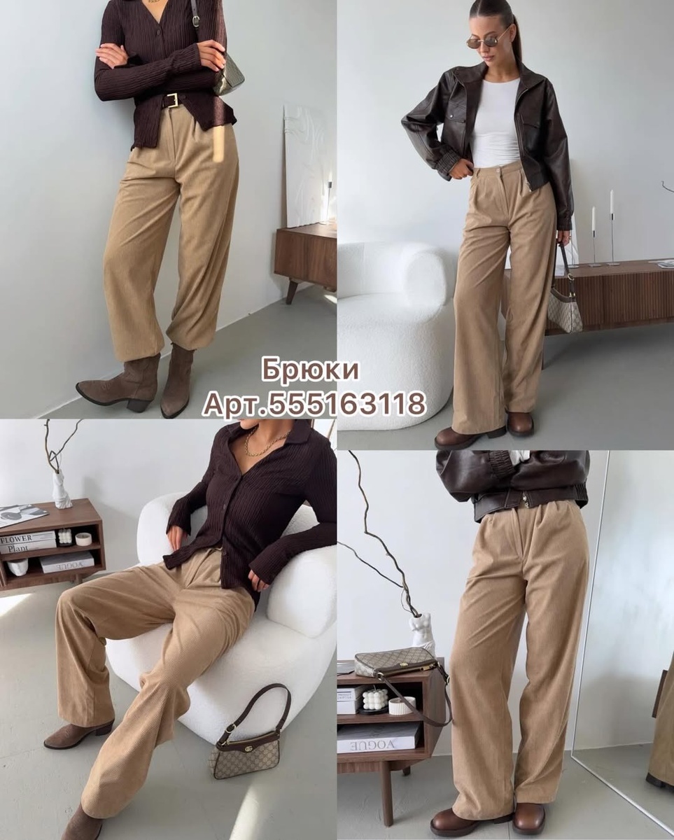 Зима — пора, когда особенно важен уют: мягкие ткани, спокойные природные тона и вещи, которые делают образ цельным без лишних усилий. В эту подборку вошли модели, которые словно созданы для современного минимализма: благородные оттенки, продуманные линии, выразительные фактуры. Каждая вещь универсальна, подходит к десяткам сочетаний и вписывается в стиль «спокойная элегантность». Ниже — детальное описание каждой модели с артикулами, нюансами кроя и рекомендациями стилиста. артикул 555163118 Брюки в тёплом бежевом оттенке — настоящая находка для повседневного гардероба. Их мягкая фактура напоминает шёлковистый вельвет: визуально добавляет глубину образу и дарит то самое ощущение тепла, которое мы так ценим зимой. • Крой прямой, слегка расширяющийся книзу, что делает фигуру стройнее • Посадка комфортная, средняя • Ткань мягко держит форму, не создаёт лишних заломов • Длина универсальная: подходит и к обуви на плоском ходу, и к каблуку • Элегантный цвет подчёркивает природные оттенки га