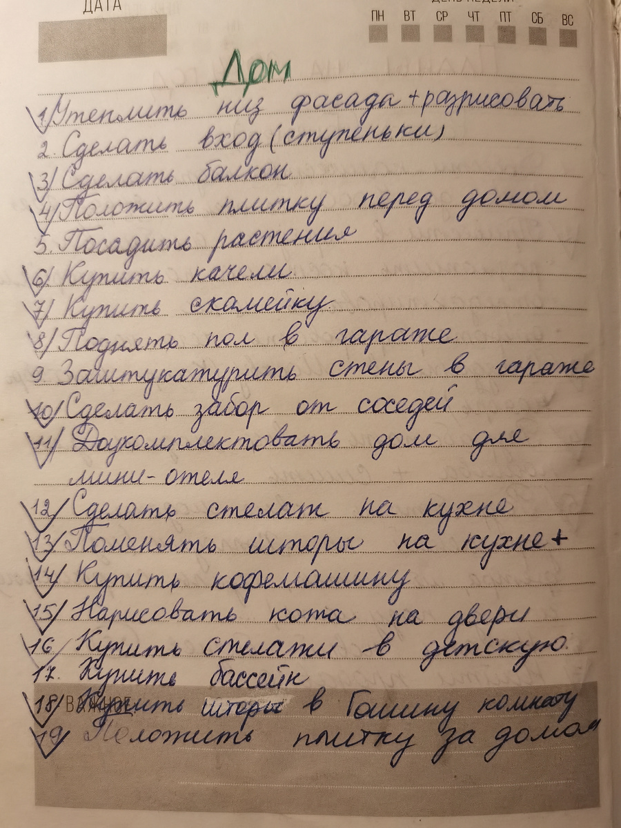Это не описка. Да, 2024 года. Я даже ежедневник на 2025 год не заводила, потому как надо двадцать четвёртый до ума довести. Немножко раньше я показывала планы по хобби (увлечения). Сделано 50 %. И это заметьте 2024 год. Где-то я очень затормозилась. А сегодня рассмотрим планы по дому. Я прям как выступающий на международном форуме: "рассмотрим планы по бла-бла-бла". Если по хобби всего 4 пункта, из них 2 выполнено. То по дому аж 19 пунктов, и из них выполнено 15. То есть 4 пункта понятно переносятся на 2026 год. Что НЕ сделано? Пока мы ходим по необлицованным ступенькам. У меня есть идея выложить мозаику. Все члены семейства пока упираются рогами и копытами и фукают на мою идею. Но у них есть время до марта-апреля привыкнуть к этой мысли и смириться. Другого выхода у них нет. Мать платит, значит, и идея будет воплощаться тоже матушкина. Растения надо посадить на те клумбы, которые только недавно сделали. Об этом ниже. Муж уже сделал половину. Но внезапно наступили холода. Бесе