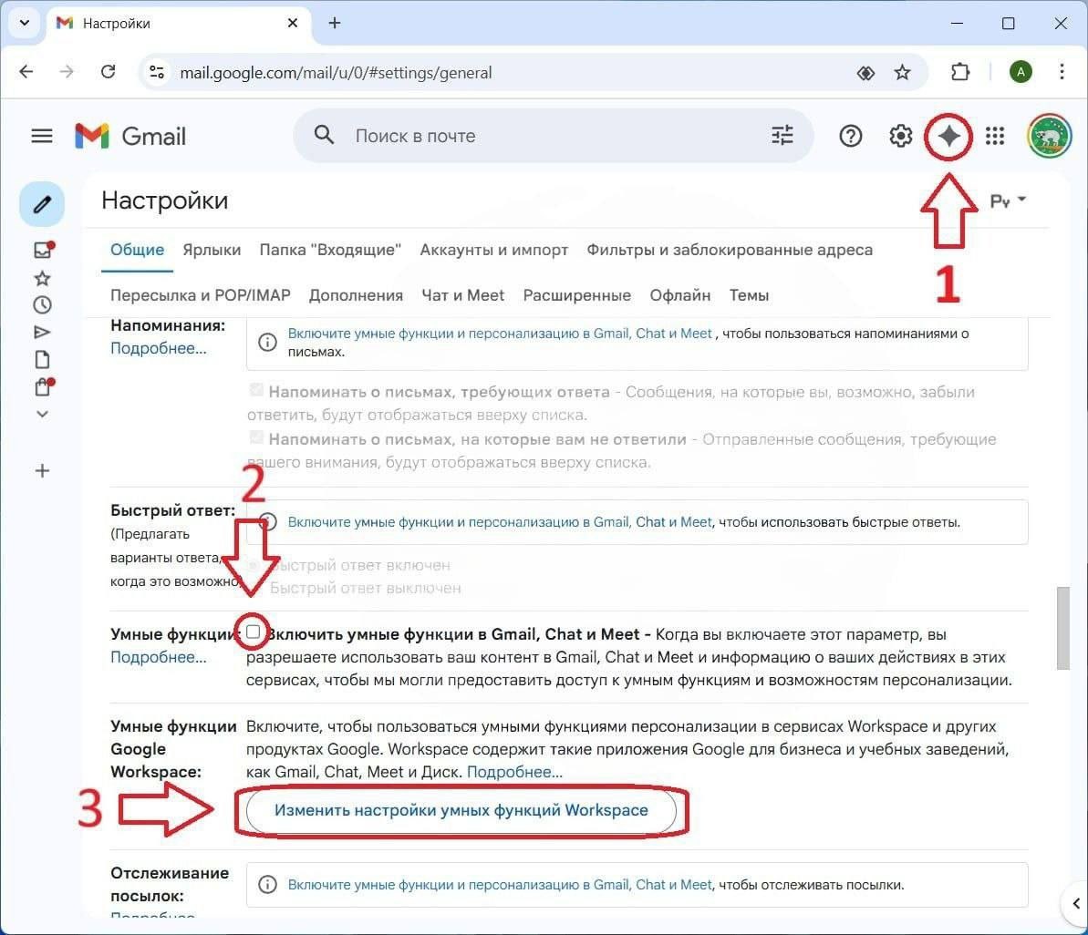⚠️ Gmail СЛИВАЕТ ваши данные для обучения ИИ — оказалось, что почта скармливает ваши личные переписки нейронкам. Google автоматически ставит СОГЛАСИЕ на передачу ваших приватных данных. Это нужно срочно отключить самому: 1️⃣ Заходим в настройки Gmail; 2️⃣ Открываем раздел Основные; 3️⃣ Находим Умные функции и убираем галку; 4️⃣ Ищем Умные функции Google Workspace и отключаем все галки. Забираем.