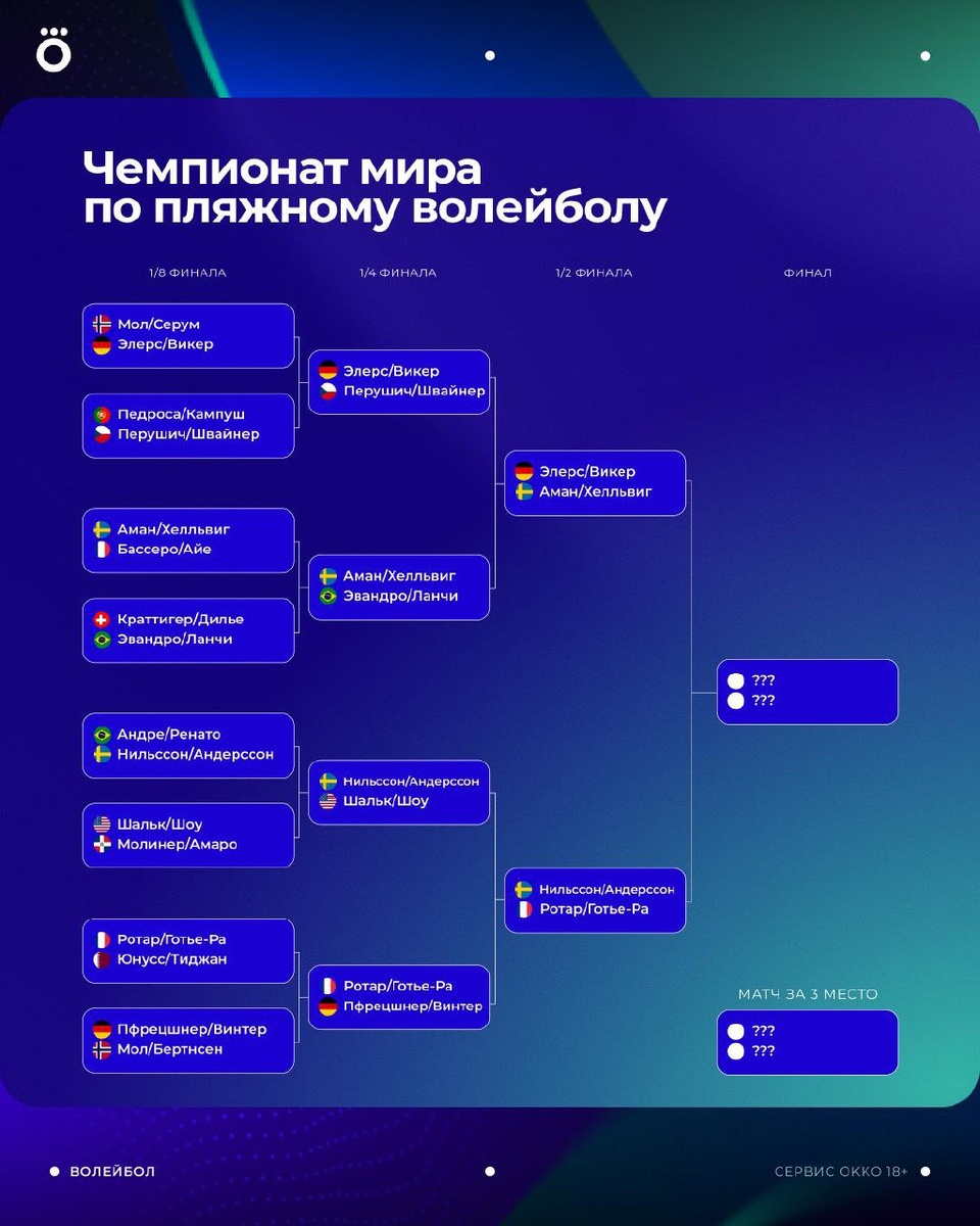 Ждем шведский финал на ЧМ по пляжному волейболу среди мужчин? 🇸🇪 Аман/Хелльвиг и Нильссон/Андерссон успешно вышли в полуфинал. Или шведской сказки не состоится? ⛱️ Уже завтра определятся финалисты ЧМ у мужчин и женщин. Включай в 7:30 утра в Okko: https://okko.tv/s/v7o
