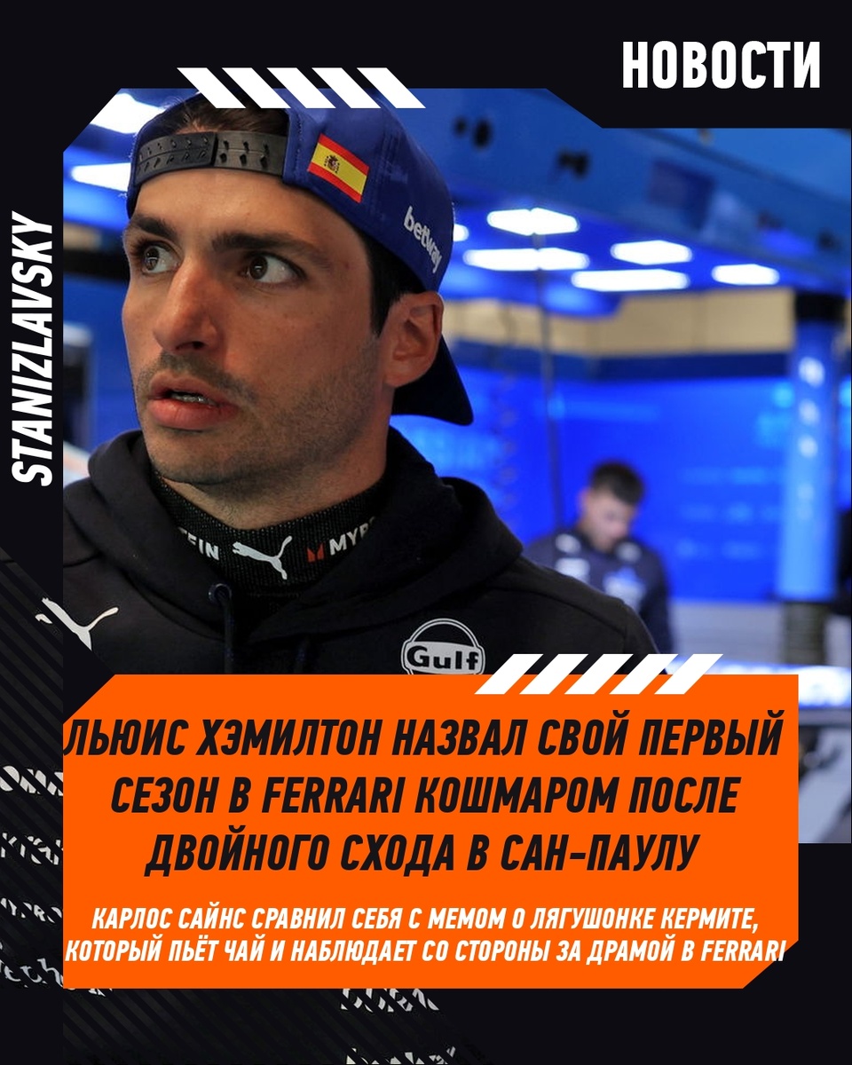 🐸 «Как говорится, это не моё дело», — сказал Сайнс в интервью перед уик-эндом Гран-При Лас-Вегаса. «Знаешь мем с лягушкой, которая пьет чай? Вот это буквально я сейчас». Он отсылал к мему с лягушонком Кермитом, пьющим чай, с надписью «Это не моё дело». Испанец покинул Ferrari, чтобы освободить место семикратному чемпиону мира, а сам неожиданно финишировал в тройке лидеров на Гран-При Азербайджана с новой командой. Тем временем Хэмилтон провёл разочаровывающий дебютный сезон в красных цветах и пока не поднялся на подиум. 🏁 После катастрофического двойного схода Ferrari на Гран-При Сан-Паулу 40-летний британец назвал свой первый сезон в новой команде Формулы-1 «кошмаром». Этот результат отбросил Ferrari на четвёртое место в чемпионате конструкторов за три гонки до финиша. Председатель совета директоров Джон Элканн попал в заголовки, призвав Хэмилтона и Шарля Леклера «сосредоточиться на вождении и меньше разговаривать». Однако Сайнс отказался комментировать внутренние дела Ferrari, ког