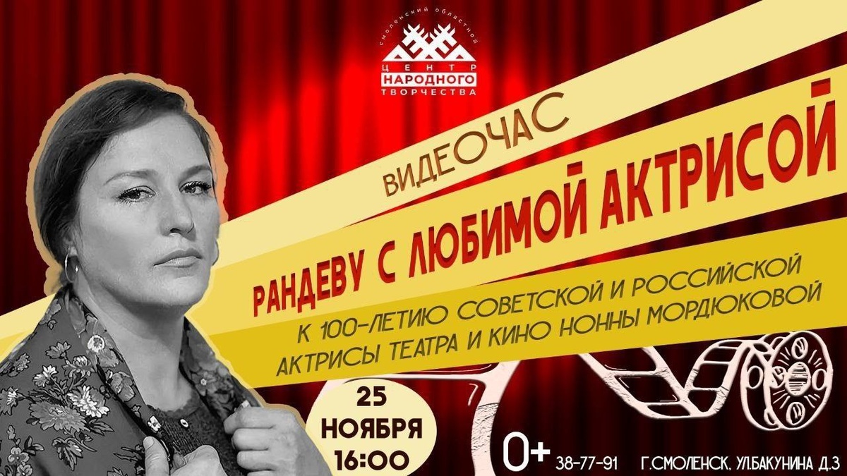 «Я никогда не сержусь. Я добрая!» 📽25 ноября в 16:00 приглашаем на видеочас, посвященный 100-летию со дня рождения великой русской актрисы, народной артистки СССР Нонны Мордюковой. Она стала настоящим символом эпохи и народной любимицей. В её фильмографии — целая галерея сильных, искренних, по‑настоящему живых женских образов. В программе: ▫️ яркая хроника жизни и творческого пути Нонны Мордюковой; ▫️ фрагменты из самых знаковых фильмов с участием актрисы; ▫️ воспоминания коллег и друзей о легендарной артистке; ▫️ малоизвестные факты из биографии Нонны Викторовны. Вход свободный 📍Адрес: ул. Бакунина, 3 ☎️Телефон: 38-77-91 #СмоленскийЦентрНародногоТворчества