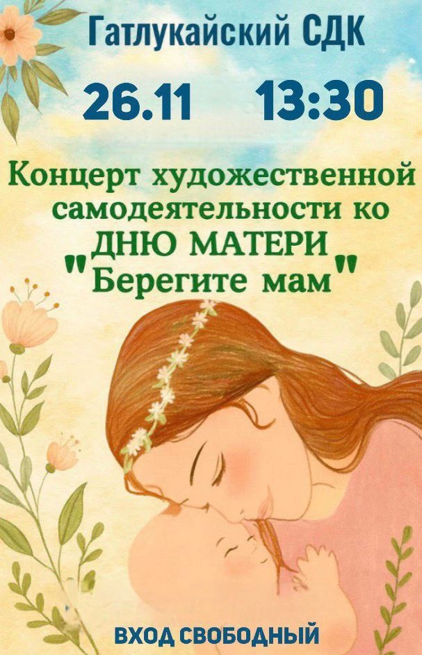 Гатлукайский СДК приглашает на праздничный концерт, посвящённый Дню Матери — самому нежному и доброму празднику. 📅 Дата:26.11.2025 🕐 Время:13:30 📍 Место:Гатлукайский СДК 🎫 Вход свободный Этот день — прекрасная возможность выразить благодарность мамам за их заботу, любовь и бесценную поддержку. Приглашаем всех жителей и гостей нашего аула провести этот праздничный день вместе с нами, в атмосфере тепла, света и искренних эмоций!