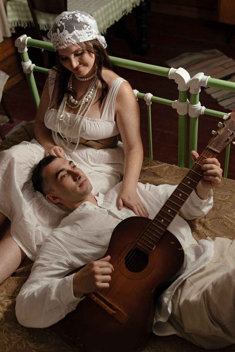 Молоко, пирожки и свадьба в деревне💍 Летом мы снимали love story в совершенно непривычном для меня стиле. Я люблю грандж и дерзость, или наоборот нежность и романтику. А тут русская деревня, этника, но с налетом трендов. Снимали мы в Сызрани, в настоящем русском срубовом доме, который отреставрировали и сделали отелем. Такое ощущение, будто ты заходишь в дом прабабушки, только аккуратно приведённый в порядок. И в этой атмосфере сама собой рождается история. Я сразу знала: образы должны продолжать этот вайб… не играть в «косплей деревни», а сделать это красиво, современно и по-настоящему. Показать и нашу культуру и трепетность момента. Никакого утрирования и заигрываний с медведями и кокошниками. Для Вики я собрала чистый и нежный образ: хлопковый многоярусный сарафан, как платье невесты, но с налетом старины; корсетный ремень, чтобы показать ее роскошную фигуру, идеальные песочные часы; и много жемчуга. Знаешь, как будто семья собирала эти бусы по чуть-чуть, по поколениям… и вот о