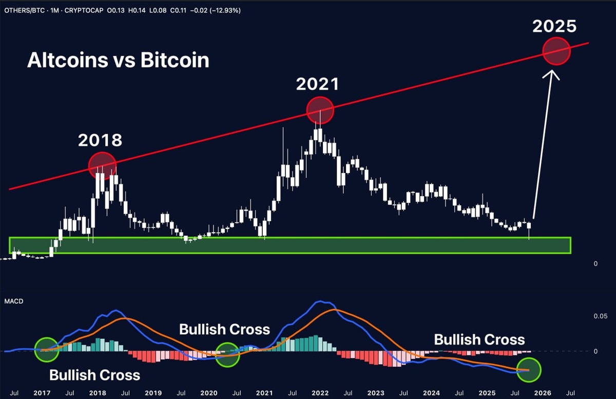 🚨 Major altcoin alert! 🚨 The rarest altcoin signal just dropped: the 3rd major MACD cross in 8 years on the Altcoin/BTC chart! 📈 Remember what happened in 2018 and 2021? Massive alt seasons followed! Each time, BTC dominance peaked, and cash flowed down: first to ETH, then to midcaps, and finally into memes. 🎉 Here's the playbook: ➡️ BTC hanging near cycle highs 🪙 ➡️ ETHBTC looking like it’s ready to bounce 🔄 ➡️ Liquidity trickling back in with stablecoin inflows 💸 ➡️ Retail? Still snoozing! 😴 If history teaches us anything, this could be that calm before the storm. 🌩 Altcoin supercycles kick off when folks are least paying attention—so keep those eyes peeled! 👀💥 #Crypto #AltcoinSeason