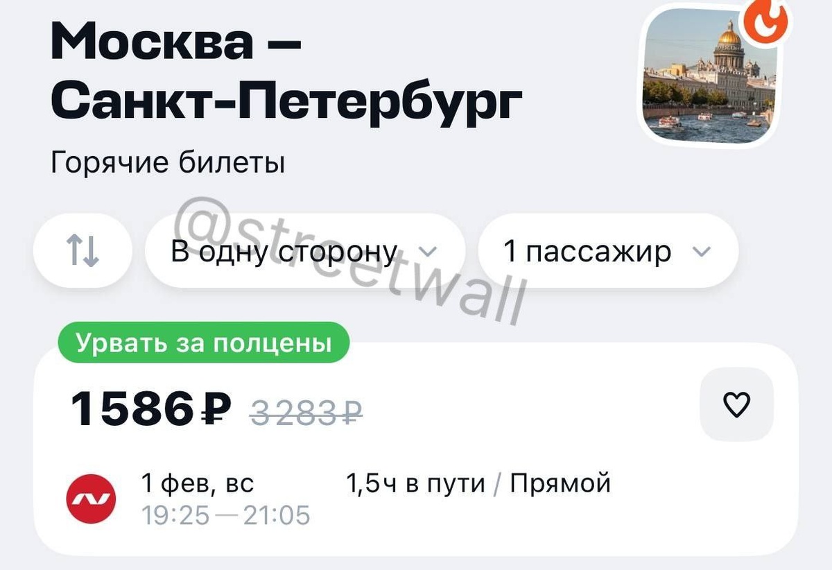 Билеты в Санкт-Петербург резко подешевели до 1500 рублей. Уехать из Москвы в культурную столицу теперь можно всего за 1500 рублей. ────────── ⚡️Важные новости – без лишнего шума!⚡️ Подпишись на канал и получай только суть: оперативно, чётко, по делу! 👉 ИнфоСплетник | @infospletnik