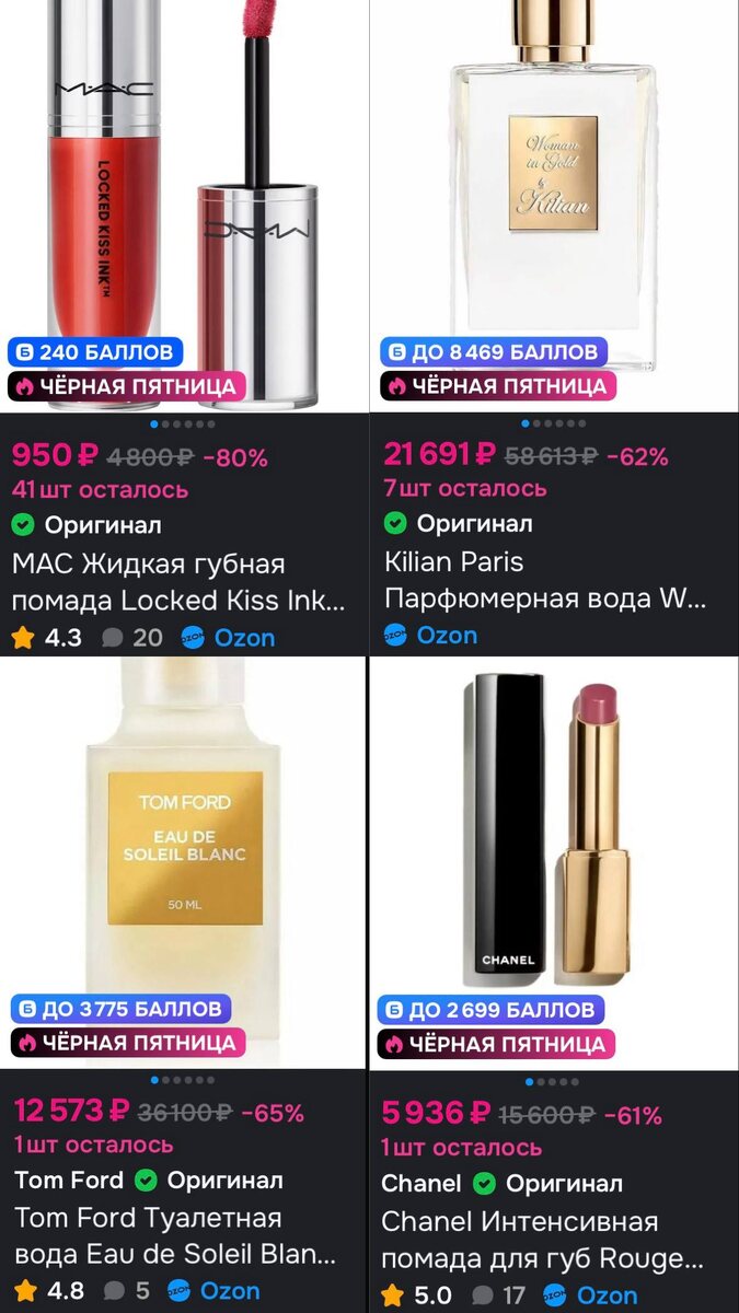нашла на OZON огромный ассортимент любимых брендов – и всё в наличии с быстрой доставкой 🤍 в подборке попались Clarins, Killian, Chanel, Montale и многие другие бренды💖 на большинство товаров сейчас хорошие скидки и кэшбек баллами! самое важное: выбирайте продавца Ozon, чтобы точно был оригинал побежала заказывать🤭