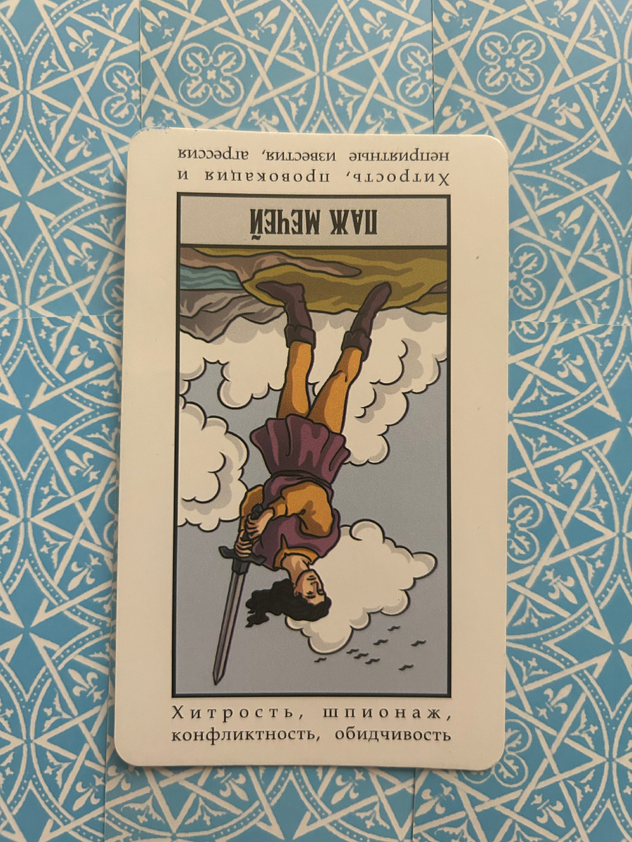 Когда «хочу понять» превращается в «я всё усложняю» Перевёрнутый Паж Мечей — это маленький разведчик, который слишком доверился своим страхам, а не здравому смыслу. Это момент, когда человек много думает, но делает мало. Слышит шум, но не слышит смысл. Собирает информацию, но теряет ориентацию. Если в прямом положении Паж Мечей — это любопытство, наблюдение и поиск истины, то в перевёрнутом — искажённое восприятие, тревожные мысли и неправильные выводы. Это карта, которая говорит: «Ты смотришь — но видишь не то. Ты слышишь — но додумываешь лишнее». Это энергия умственных перекосов: • неправильные выводы • фантазии, принятые за факты • избыточная подозрительность • обидчивость и импульсивные реакции • человек ждёт удара там, где его нет • страх ошибки, который блокирует действия • разговоры без дела, тревога без причины • желание всё контролировать, но отсутствие ясности Перевёрнутый Паж Мечей — это как «шум в голове», который мешает услышать своё настоящее «я». Это карта недопонимани
