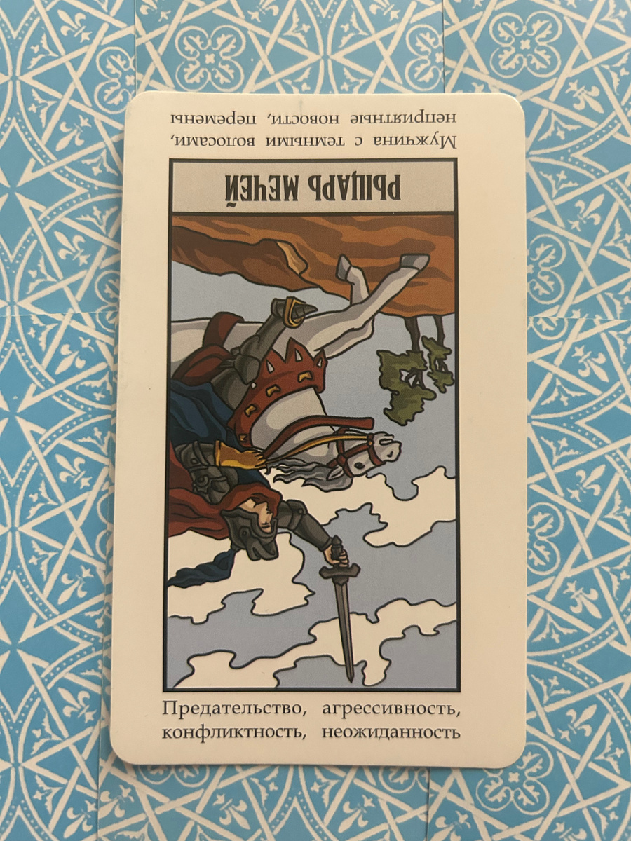 Когда напор превращается в хаос В прямом положении Рыцарь Мечей — это энергия скорости, решимости, ясного хода мысли и резкого рывка вперёд. Но сто́ит ему перевернуться — и прежняя направленность теряется. Это как гонщик, который нажал газ, но не знает, куда поворачивает трасса. Это не про силу. Это про потерю контроля. Что символизирует перевёрнутый Рыцарь Мечей? Это энергия разбросанности и конфликтности: • поспешные решения • слова, сказанные слишком резко • действия, которые приносят больше вреда, чем пользы • импульсивность, злость, нетерпение • навязывание своей позиции • попытка «ломать» ситуацию вместо того, чтобы понять её • усталость, которая прорывается агрессией Перевёрнутый Рыцарь Мечей — это человек, который слишком спешит, чтобы услышать себя. Возможные значения: — конфликты, ссоры, раздражительность — попытки давить, спорить, доказать «любую цену» — мысли скачут, логика ускользает, решения меняются — человек может быть резким, обидчивым, колючим — риск ошибок из-за п