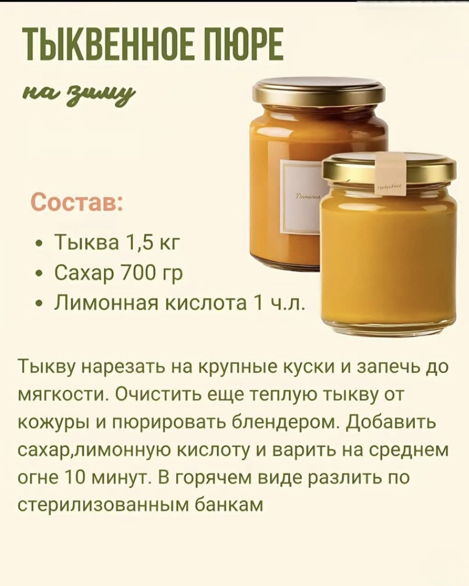 Солнечное, сладкое и невероятно ароматное тыквенное пюре — идеальный способ сохранить вкус осени на всю зиму. Ингредиенты: Тыква — 1,5 кг Сахар — 700 г Лимонная кислота — 1 ч.л. Приготовление: 1. Нарежьте тыкву крупными кусками и запеките в духовке до мягкости. 2. Пока тыква еще тёплая, очистите её от кожуры и измельчите в блендере до однородного пюре. 3. Переложите пюре в кастрюлю, добавьте сахар и лимонную кислоту. Варите на среднем огне около 10 минут, постоянно помешивая. 4. Разлейте горячее пюре по стерилизованным банкам и закройте крышками. Дайте полностью остыть. Совет: Это пюре можно использовать как сладкую начинку для пирогов, оладий или просто намазывать на хлеб с маслом — вкус осени в каждой ложке! Поделиться с миром: Такое пюре — настоящий солнечный запас на зиму. Его аромат и насыщенный вкус точно захочется показать друзьям и близким! 🙌 Поддержите канал! Если статья была полезной — поставьте лайк 👍, напишите комментарий и обязательно подпишитесь, что