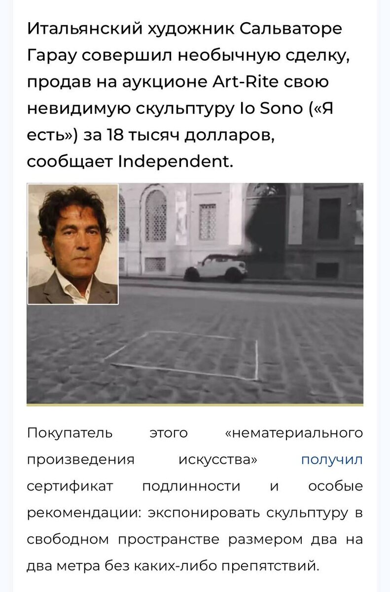 Художник продал НЕВИДИМУЮ скульптуру за 18 000$. Если вы думаете, что у вас нет никаких талантов, вам нечего продавать - продавайте НИЧЕГО! 😂 А если серьезно, Гарау объяснил это через принцип неопределённости Гейзенберга: даже вакуум полон энергии. Пустота — не пуста. 🔥Ты не видишь энергию поля — но она работает 🔥Ты не уносишь с собой предмет — но уносишь состояние 🔥Ты не можешь измерить перемену — но ты уже другой человек Мы живём в эпоху, где самое ценное — невидимо. И ты — часть этого пространства. Именно поэтому многие, имея много материального - не чувствуют счастья. Ведь измеряется оно явно не материей. Как вам такие новости? А что вы думаете про пустоту?