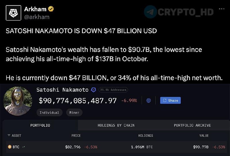 👀 Сатоши Накамото обеднел почти на $47,000,000,000 – Arkham