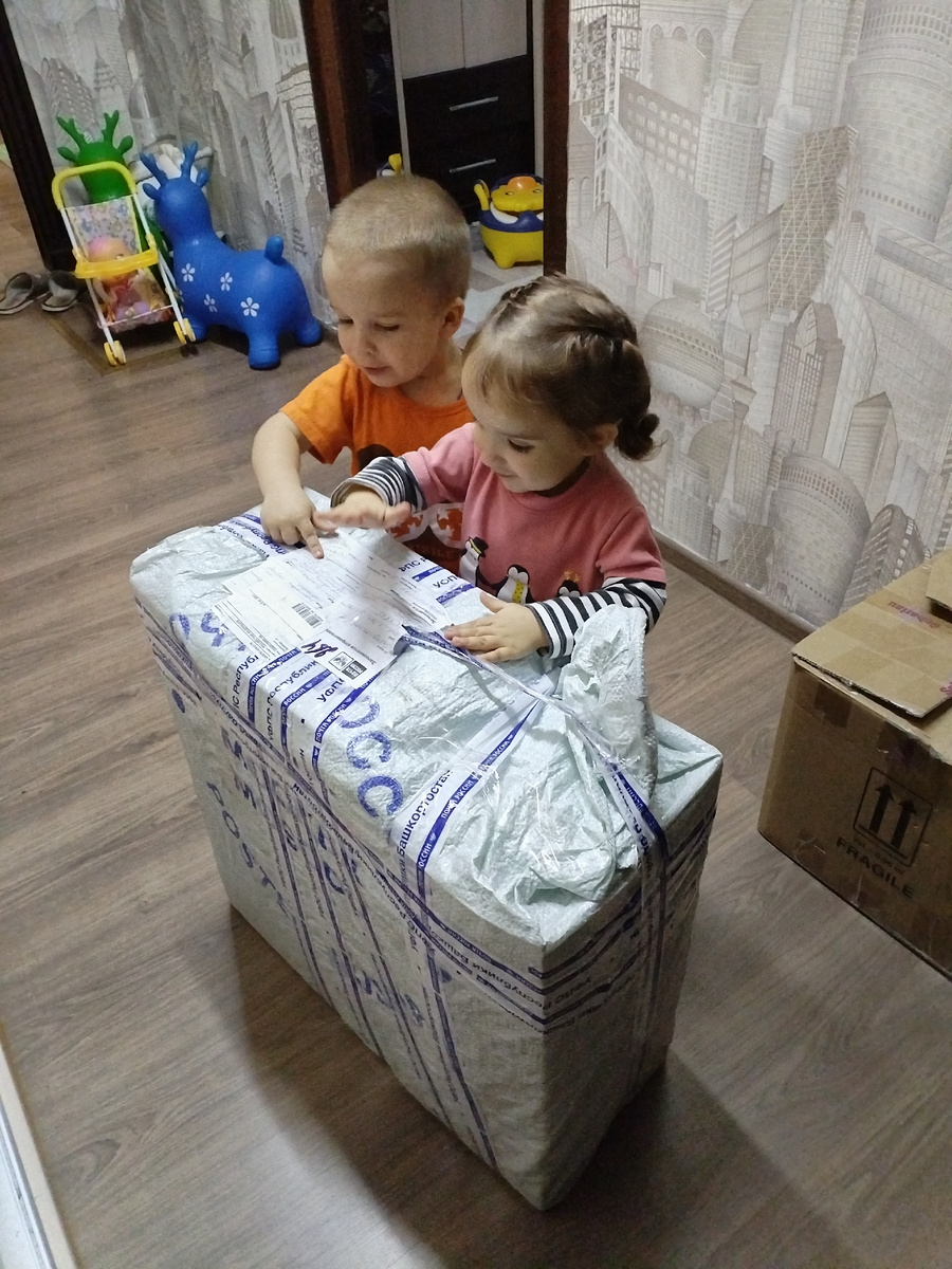 Малыши, увидев меня с посылкой, заверещали: "Падаайки! Падаайки!" Балуют их подписчики, знают уже, что им подарки.