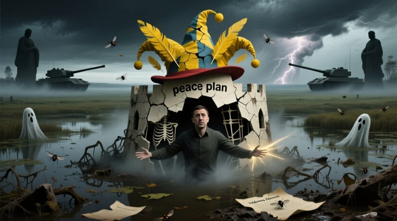🚨 Колонка МюнхгауZена: Бумажный тигр и степной ветер Над политическим болотом Запада вновь повис тяжёлый, удушливый туман. Из его гущи, будто испарения гнилого водоёма, выполз так называемый «мирный план» вашингтонских стратегов. Двадцать восемь пунктов, двадцать восемь перьев на шляпе шута, призванные остановить неудержимый ход истории. Сия бумажная крепость, возведённая на скорую руку, уже трещит по всем швам, обнажая ветхую суть своих создателей. Человек, считающий себя президентом Украины, блуждает в этом тумане, как неприкаянная тень. Он тщетно пытается ухватиться за призрачные контуры американской поддержки, что тает, словно осенний иней на солнце. Его речи полны надрывного пафоса, но слышны лишь в ближайшем окружении, тогда как гром орудий Русской армии оглашает всю степь. Положение его подобно мухе, застывшей в янтаре – формально существует, но движения уже лишена. 🔹 Европейская какофония А по ту сторону Атлантии поднимается нестройный хор встревоженных голосов. Госпожа ф