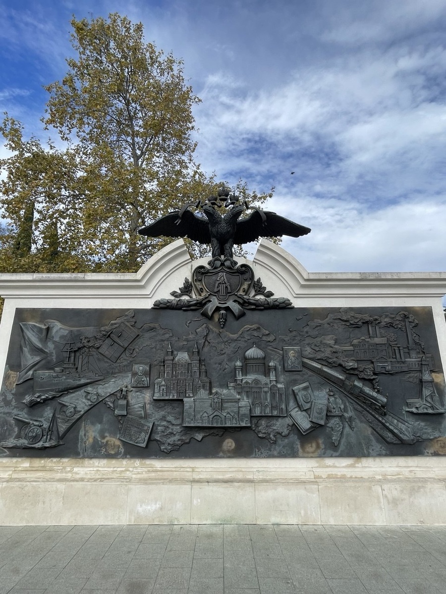 На фоне этого барельефа установлен памятник, а знаменует он собой всю Россию. И вензель Александра III нам с вами хорошо знаком, на Троицком мосту такой как раз и повторяется, перемещаясь с вензелем Марии Фёдоровны.