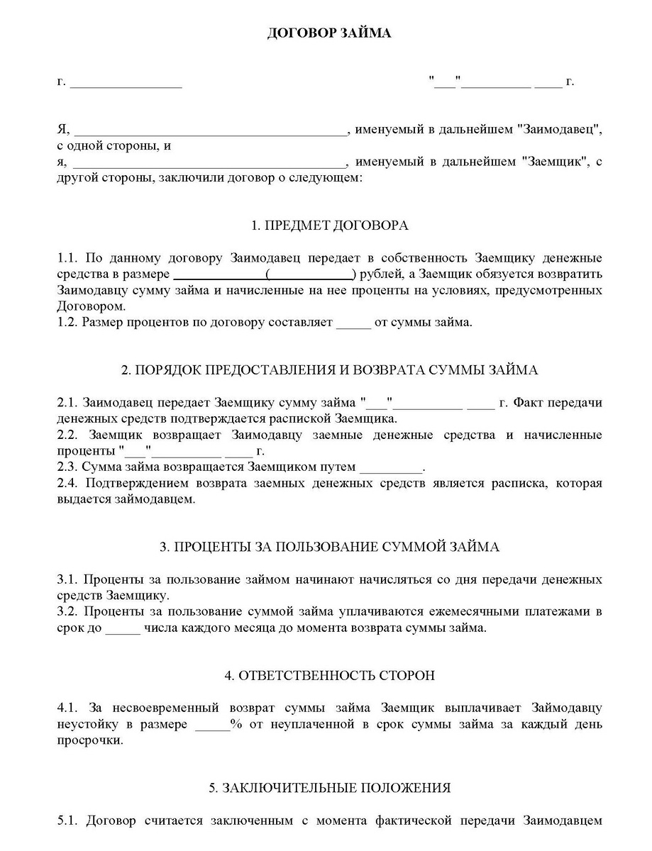 Выглядит договор займа примерно так: