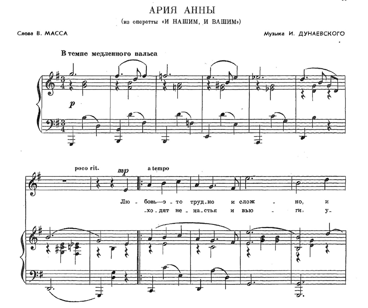 Пришли выходные- время отдать должное культуре "Ария Анны" из оперетты »И нашим, и вашим» Исаака Осиповича Дунаевского на слова Владимира Захаровича Масса. Слова: Любовь это трудно и сложно, и сладко, и горько чуть-чуть О, если бы было возможно минувшее время вернуть! Глухая тревога тает и вдруг возникает опять Порою так трудно бывает открыто признаться, сказать: Ты очень мне нужен в тебе одном все радости и печали Нас беды с тобою венчали, нас грозы с тобою встречали но все мои сны тобою полны и навеки тебе лишь тебе верны! Уходят ненастья и вьюги Уходит и стужа, и зной, уходят друзья и подруги, а ты остаешься со мной. Тебе посвятить я готова всю силу и нежность любви. Скажи мне хотя бы полслова, хоть взглядом меня позови. Ты очень мне нужен в тебе одном все радости и печали Нас беды с тобою венчали, нас грозы с тобою встречали но все мои сны тобою полны и навеки тебе лишь тебе верны!