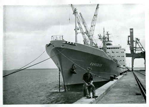 Я попал в группу вместе с приятелем Борей Слюсаревым, Володей Мацко и Володей Суховым. Последние учились в параллельных группах нашей роты. Нам надо было сесть на теплоход «Кимовск», который должен был зайти в Клайпеду. В Отделе кадров выдали нам железнодорожные билеты на следующий день и не уточнили дату прихода «Кимовска». Побросав в курсантские чемоданы свой нехитрый скарб, мы немедленно выехали в Клайпеду. Прямо с поезда побежали в порт, где на проходной показали свои паспорта моряков и попросили сообщить на каком причале стоит теплоход «Кимовск».
