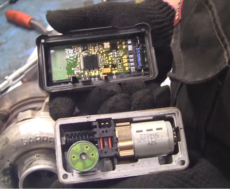 Моторчик. Электрический двигатель, жестко фиксируемый в корпусе, работа которого превратить команды блока управления двигателем в регулировку потока воздуха в "горячей части" турбины через клапан вестгейта или специфический узел, называемый "геометрией". Моторчик либо работает, либо нет. Работоспособность проверяется специальным тестером: