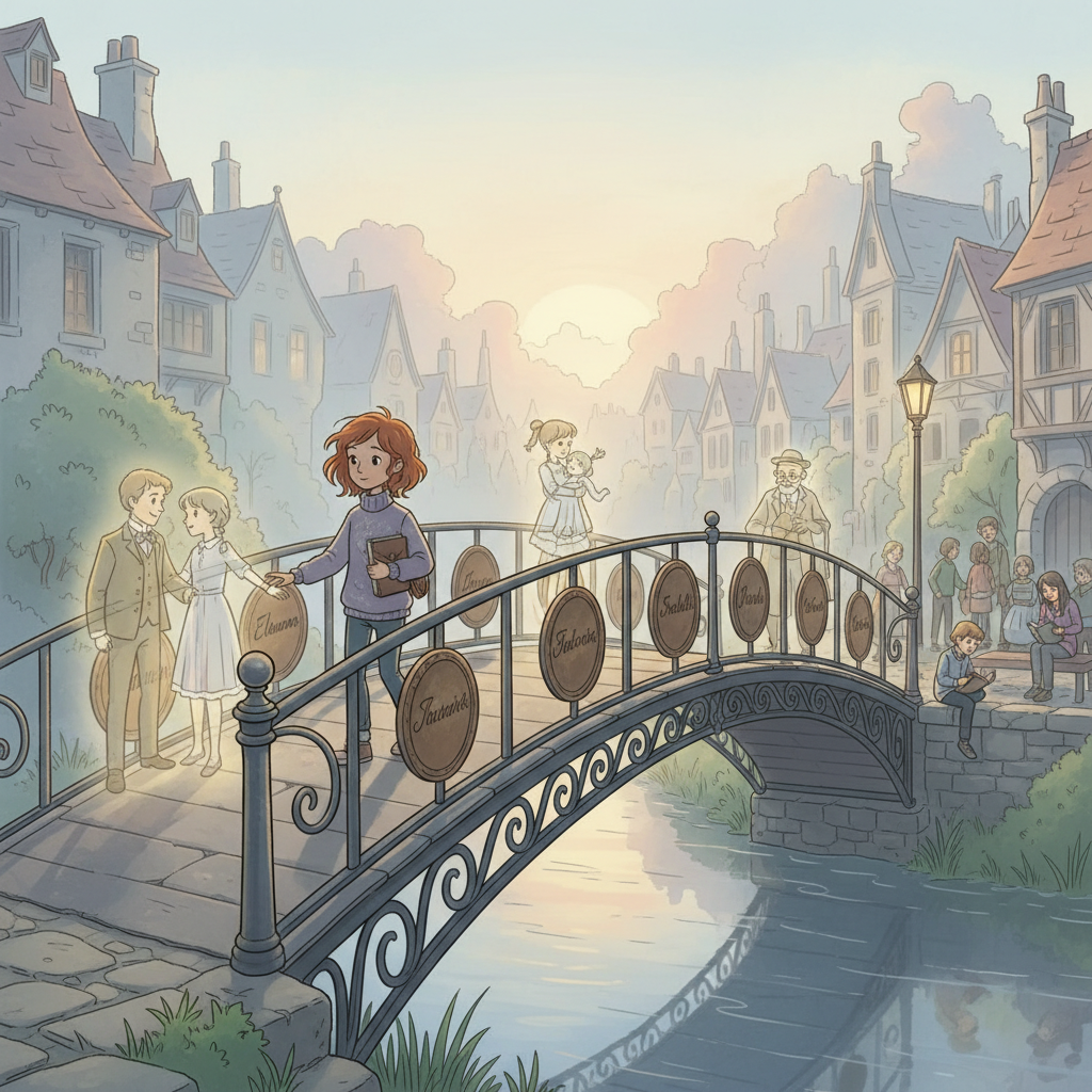Через реку в старом районе города тянулся пешеходный мост — чугунный, с узорчатыми перилами и бронзовыми медальонами, на каждом из которых было выгравировано чьё‑то имя. Местные называли его «Мост воспоминаний»: считалось, что если пройти по нему, касаясь ладонью каждого медальона, то услышишь шёпот прошлых лет. Однажды утром на мосту появилась девочка Соня. Ей было десять, и она только что переехала в этот город. В школе её пока не принимали: «Ты новенькая, ты не знаешь наших правил», — говорили ребята. Соня бродила по улицам, пока не наткнулась на мост. Она медленно шла, проводя пальцами по холодным медальонам. И вдруг услышала: — Мы с Петей впервые поцеловались здесь…