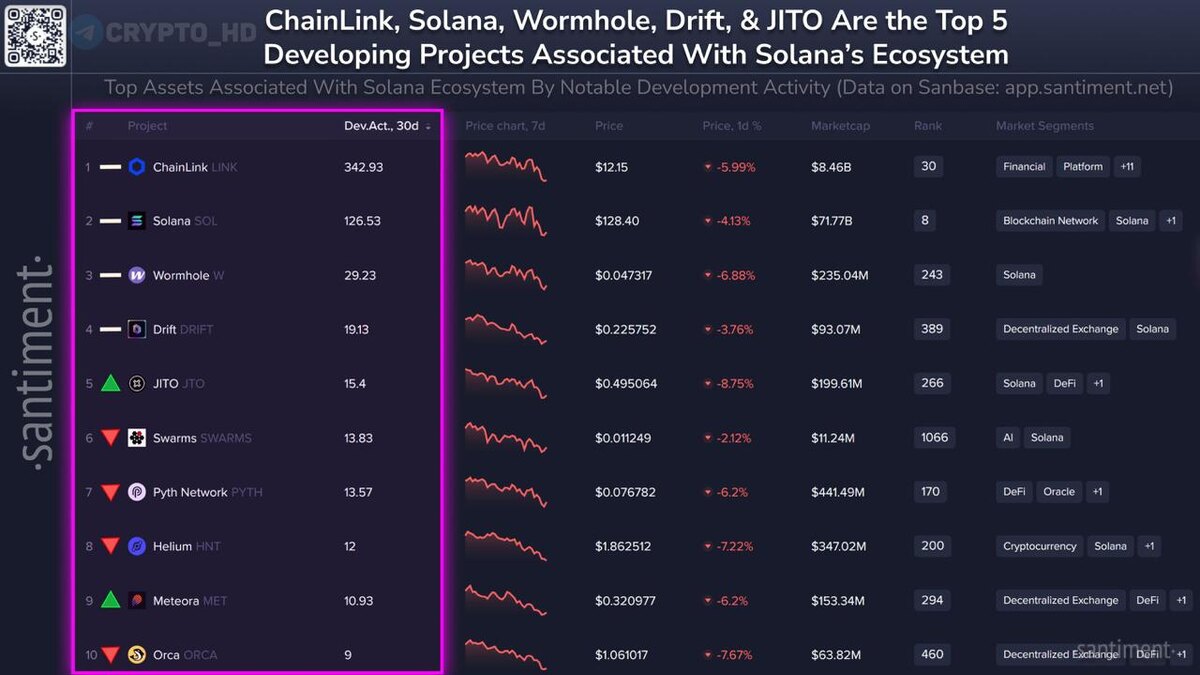 #ончейн #рейтинг #sol 📊 Santiment: ТОП-10 криптопроектов экосистемы Solana по активности разработчиков за последние 30 дней. 1. ChainLink #LINK 2. Solana #SOL 3. Wormhole #W 4. Drift #DRIFT 5. Jito #JTO 6. Swarms #SWARMS 7. Pyth Network #PYTH 8. Helium #HNT 9. Meteora #MET 10. Orca #ORCA Ранее: прошлый топ Сryptо Headlines