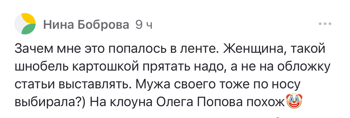 Всем приветики, мои хорошие😊. Вчера прилетел мне такой комментарий и это было только начало. Самое смешное, что в статье разглядеть нос моего мужа невозможно 🤣. Ну да ладно, сначала можно подумать, что женщина первый раз на моём канале, но следующими комментариями она полностью развеяла первое впечатление. Человек знает меня и следит за всеми статьями и пришла целенаправленно, как она думала задеть или обидеть. Знаем мы такие недоразумения 🤣. Ну что тут скажешь. Иногда очень хочется промолчать и пройти мимо, особенно когда люди — словно по команде, кистью яркой краской начинают разрисовывать содержание своей души. Однако в данном случае задели моё личное пространство и достоинство, чему я предпочитаю дать достойный ответ. Первое, что приходит на ум — почему я должна вообще реагировать на комментарий, где ни о чем, кроме ярко выраженного желания обидеть, не идёт речи? Ваша замечательная оценка моей внешности и даже сравнение с клоуном — это, по сути, боевой клич недостойного чело
