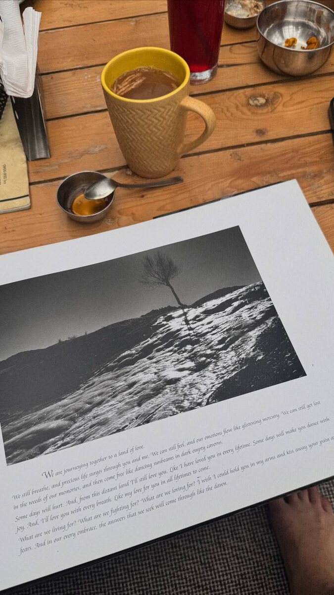 Это был день, когда солнечный дождь сменился радугой. Впервые я увидела радугу в Индии. Бир. Я приехала сюда забыть. Полетать на парашюте, получить дозу адреналина, что отвлечет от ощущения этого присутствия. Это присутствие, словно аромат, что больше никогда не покинет меня. Это словно возникшая еще одна конечность, которая будто всегда была, но сейчас она так ощутима. Это словно ты жила до этого момента всего лишь для того, чтобы этот момент настал и вы встретились. Это словно - я никогда больше не буду одна, потому что сейчас я везде чувствую и тебя. Это словно - может я уже схожу с ума и окей, вселенная, а когда это пройдет? Время в этом случае работает? Или я все так же буду чувствовать это? Если что парашютные полеты не помогли, но это было классно Вернемся к дождю. Из-за него мы не полетели в тот день, но я нашла ее. Эта книга позвала, говоря «у меня кое-что для тебя есть» - я открываю и опять эта связь.. что говорит: перестань чувствовать боль утраты, ведь за ней стоит лю