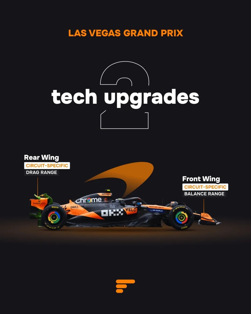 Обновления команд на гран-при Лас-Вегаса: Макларен обрезали закрылки переднего крыла и привезли 2 опции заднего крыла под низкий прижим. Ред Булл привезли закрылки переднего крыла на меньший прижим. Рейсинг Буллс доработали закрылок заднего крыла под специфику трассы.