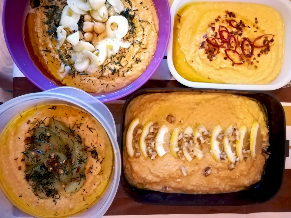Основа хумуса - это нут. А так же тхина (она же тахини, это кунжутная паста с оливковым маслом), сухая копчёная паприка и зира. Соль и оливковое масло. Добавки к основе могут быть разнообразные. Хумус по моему сочетается вообще со всем подряд. Продуктов брала примерно: ✔ Нут сухой - 500 г; ✔ Кунжут - 100 г; ✔ Масло подсолнечное рафинированное - 60 мл; ✔ Сок лимона - 50 мл; ✔ Паприка молотая - 5 г; ✔ Зира (кумин) - 5 г; ✔ Соль - 5 г; ✔ Вода (отвар нута): ~100 мл (для консистенции). Вначале на сутки замачиваем нут. Затем для приготовления тхины слегка подрумяниваем кунжут. Лучше это делать в духовке. Подготавливаем тхину: измельчаем кунжут, добавляя к нему масло, можно подсолнечное, рафинированное. Нут отвариваем не менее 2 часов. Даём слегка остыть. И также отправляем в блендер. Добавляем паприку и зиру, соль и лимонный сок. Кстати, для того, чтобы паста получилась более однородная, мы немного вливаем того отвара, в котором готовился нут. Всё перемешиваем. Пробуем на соль, и раскладыва